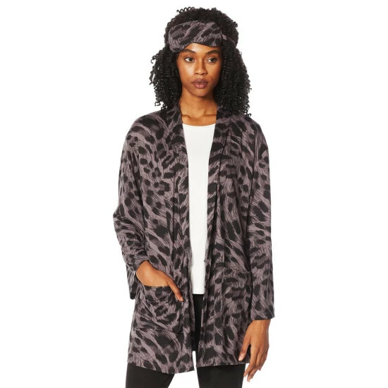 Enjoy your downtime in style. This luxuriousleopard-print robe and mask set takes relaxation to new levels.