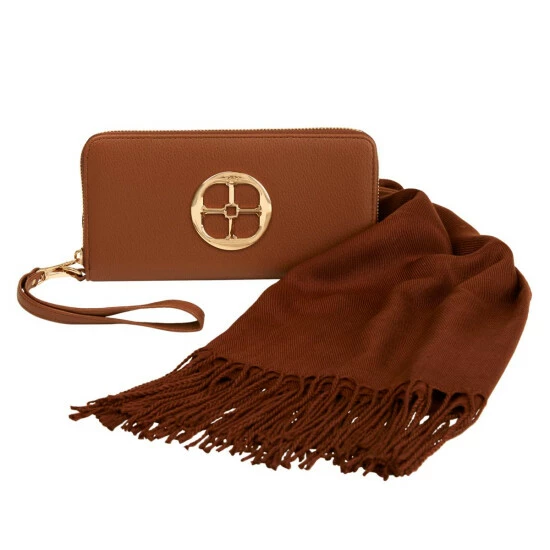 A great gift for any time of year! This large, slim wristlet is super functional thanks to the many interior pockets, and the matching scarf is a lovely addition to any outfit.