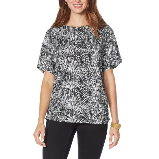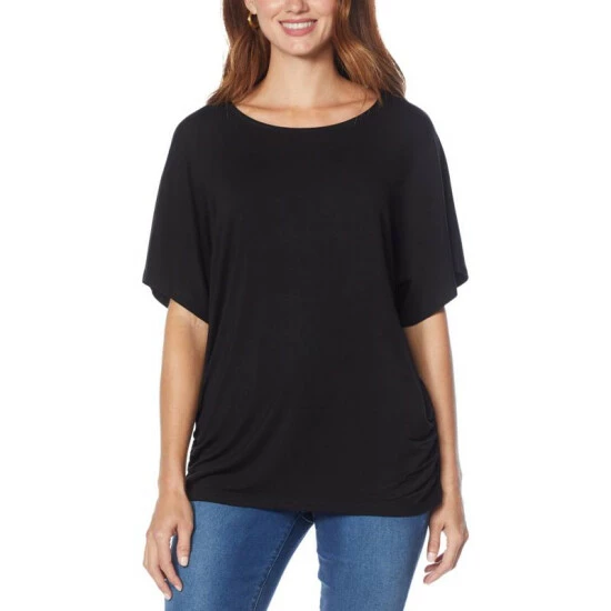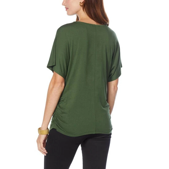 Ruched detail and dolman sleeves add a chic, high-fashionedge to this classic, workday-to-weekend top.