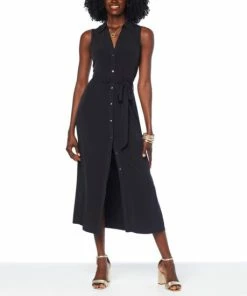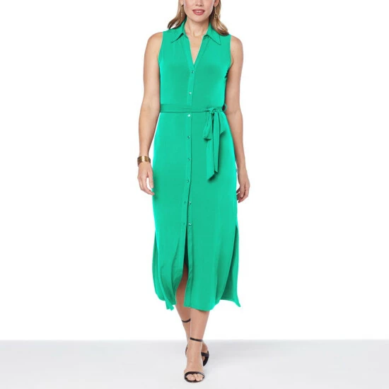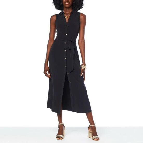 | Design Features: | Side slits; self-fabric tie belt, threaded loops |