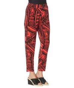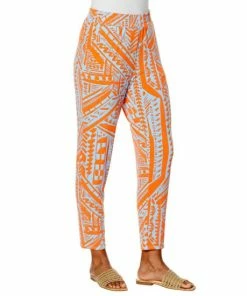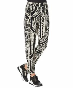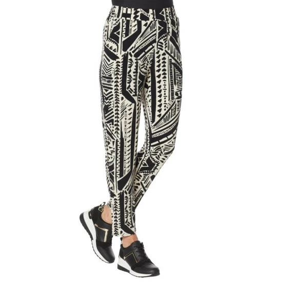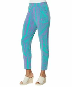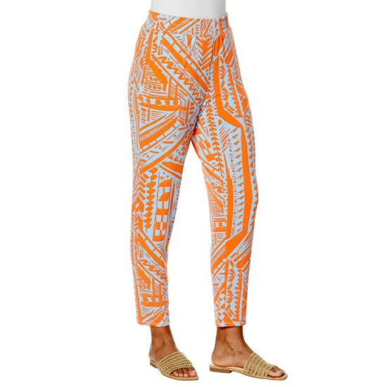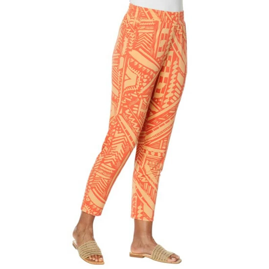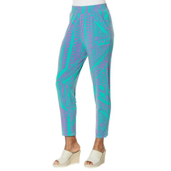 A fashionable print adds a funelement to this jersey knit ankle pant that’s comfortable, yet polished.