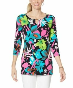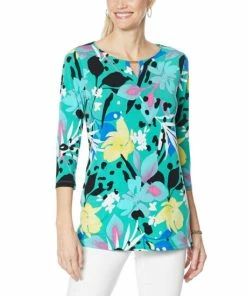A new office-to-after-hours option from Imanwith a flattering keyholeneckline, fun, playful printandslim, 3/4sleeves.