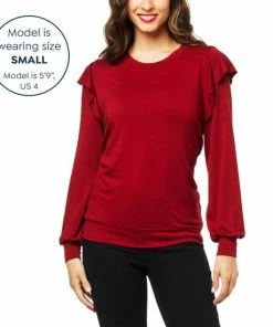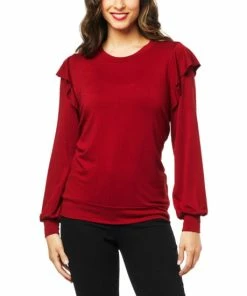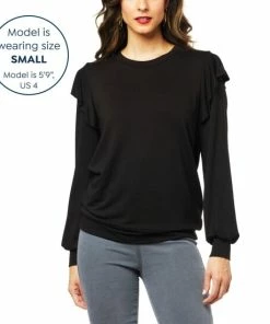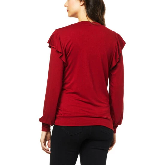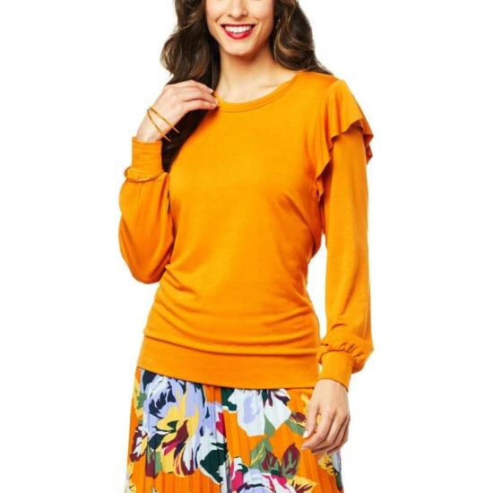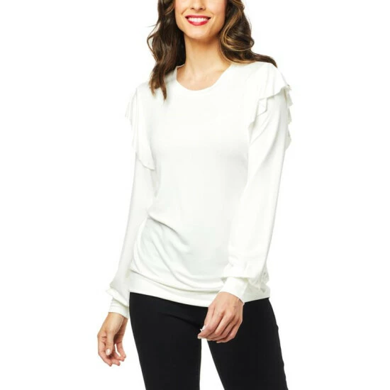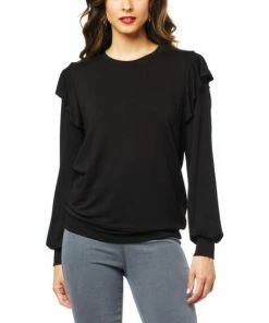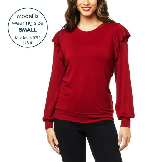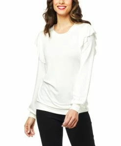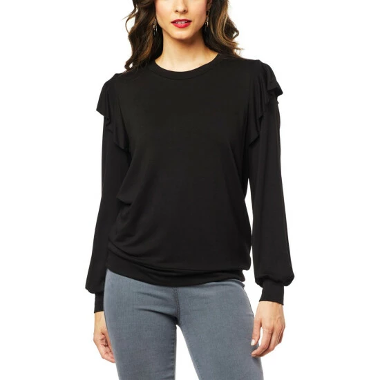 Dress this statement sweatshirt up or down and let those marvelous ruffle-trim shoulders charm attention your way.