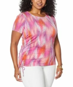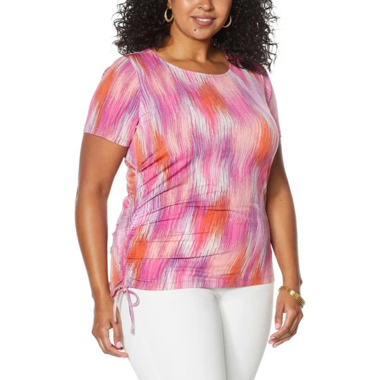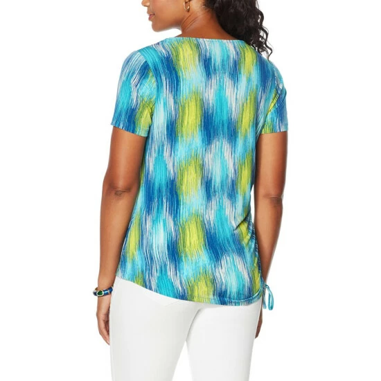 Leave no space un-designed! Colorful ikat print and an adjustable side tie add texture and styleto your everyday look.